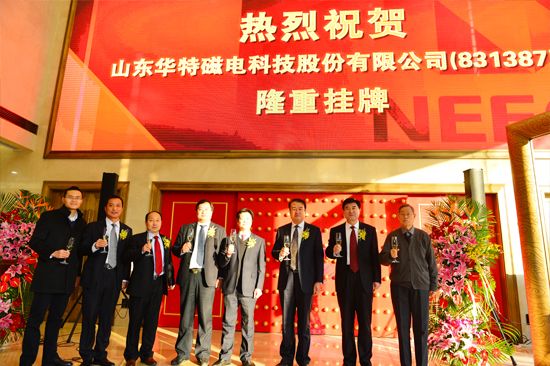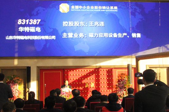 12月8日上午,山東華特磁電科技股份有限公司“新三板”掛牌儀式在全國中小企業股份轉讓有限責任公司隆重舉行。濰坊市金融工作辦公室副主任張新華、臨朐縣委常委、常務副縣長衣利民、臨朐縣金融工作辦公室主任高凌利、臨朐縣城關街道黨工委書記沈明新、臨朐縣東城街道黨工委書記孫傳坤、山東華特磁電科技股份有限公司董事長王兆連及公司股東和高管、臨朐縣相關企業負責人出席本次掛牌儀式。
