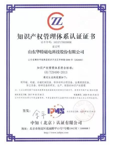 2017年3月6日,華特公司順利通過中知(北京)認證有限公司知識產權管理體系認證審核,并獲得知識產權管理體系認證證書,這標志著華特公司在知識產權管理方面邁入一個新臺階。