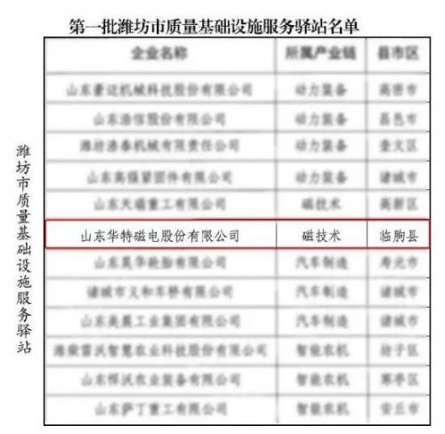 近日,濰坊市市場監管局發布了《關于公布第 一批濰坊市質量基礎設施“一站式”服務企業中心和質量基礎設施服務驛站的通知》,華特磁電成功入選“第 一批濰坊市質量基礎設施服務驛站”。