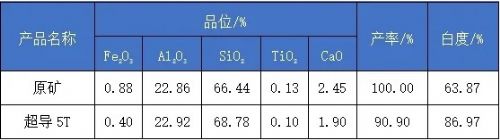 原礦經(jīng)超導(dǎo)5T磁選,得到Fe2O3 0.40%、Al2O3 22.92%、SiO2 68.78%、TiO2 0.10%、CaO 1.90%、白度86.97%、產(chǎn)率為90.90%的高嶺土精礦 產(chǎn)品。