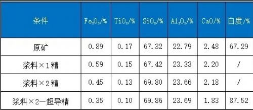 由試驗結(jié)果可知:原礦經(jīng)電磁漿料+電磁漿料+超導(dǎo)磁選可得到Fe2O3 0.35%,白度87.52%的高嶺土精礦 產(chǎn)品。