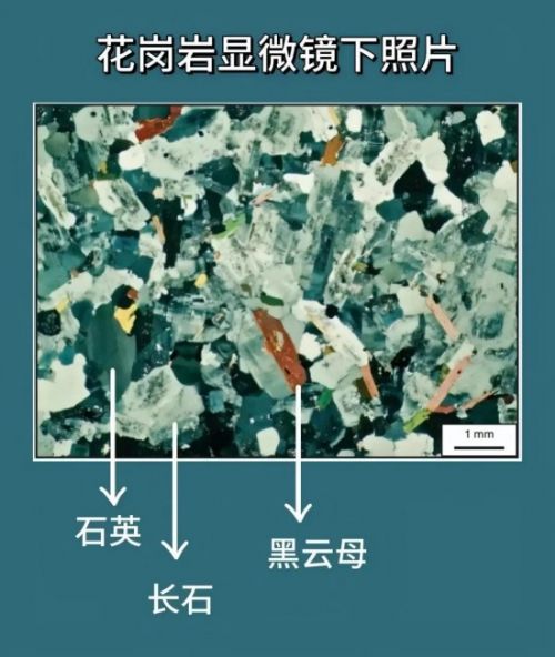 花崗巖主要組成礦物為長石、石英、黑白云母等,石英含量是10%~50%。長石含量約總量之2/3,分為正長石、斜長石(堿石灰)及微斜長石(鉀堿)。不同品種的礦物成份不盡相同,還可能有含輝石和角閃石。