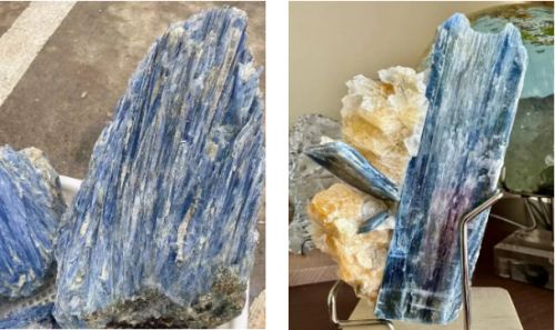 藍晶石為三斜晶系,通常呈扁平狀的柱狀晶體,晶面上有平行條紋。顏色呈淡藍色或青色、亮灰白等。硬度為5.5~7.0,比重:3.53~3.65。